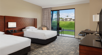 Only available for existing bookings. Rooms are located on the ground floor of the Palace Tower, near the Kohala pool, main lagoon, wedding chapel, and Nui Italian restaurant, and feature views of the tropical resort gardens. Additional amenities include a 55-inch TV, plush Hilton bedding, and Kohala Spa Mango bath products.