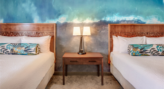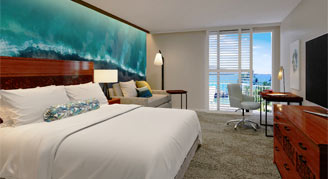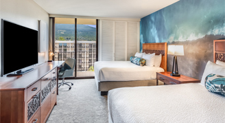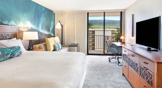 Guest rooms are rich in decorative themes, colors, and textures, providing an abstract representation of island characteristics like lava, Hawaiian tattoo designs, and native plants. In-room Kona coffee is provided daily. The hotel does not offer adjoining rooms or rollaway beds. Housekeeping is provided every other day.