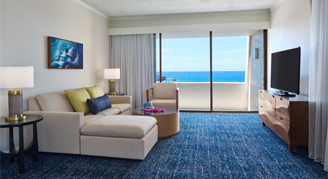 Suites feature ocean views. Additional amenities include access to the Voyager 47 Club Lounge. Club access includes nightly turndown service, exclusive lounge access, locally inspired breakfast with premium Kona coffee from 7 a.m. - 9:30 a.m., early evening pupus with a selection of beverages including local craft beer and signature wine from 4:30 p.m. - 6:30 p.m., complimentary Wi-Fi and social and meeting space.