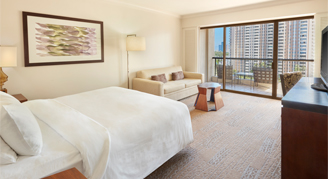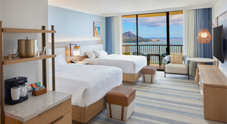 Newly renovated guest rooms are located in the Rainbow Tower on floors 18 and above. They are located on the Diamond Head side and feature views of the ocean, coastline and Diamond Head.