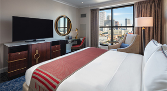 This thoughtfully furnished room features warm woods and soft neutrals, accented by original artwork and custom light fixtures. A highlight of this Art Deco-inspired room are the views of downtown New Orleans, the Crescent City Connection Bridge, or the hotel's quiet courtyard.