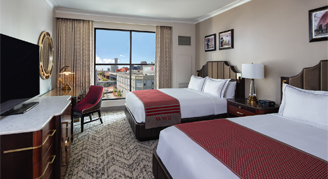 This attractive guest room features two plush queen beds finished with premium linens, original artwork, custom light fixtures, and features views of downtown New Orleans, the Crescent City Connection Bridge, or the hotel's courtyard.