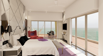 These suites are located in the South Tower on the higher floors and feature an expansive ocean view with a large corner terrace and plunge pool. Décor and furnishings may vary based on location.