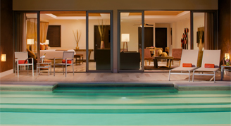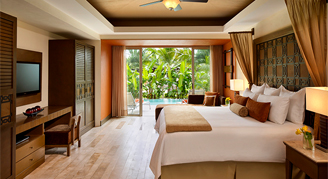Suites are located on the ground floor and feature a garden view. Additional amenities include a separate living area, a soaking tub and direct pool access.