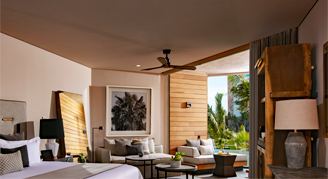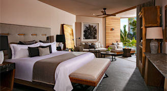 Suites are designed in a contemporary style with earthy tones and are furnished with locally-inspired furniture. Select suites include a private plunge pool or access to a semi-private swim-out pool on the outdoor terrace.