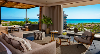 Suites feature an ocean view. Additional amenities include a separate living room and an expansive outdoor terrace with a private plunge pool.