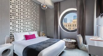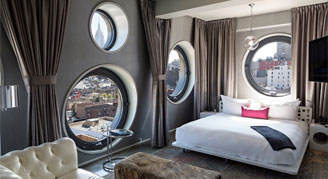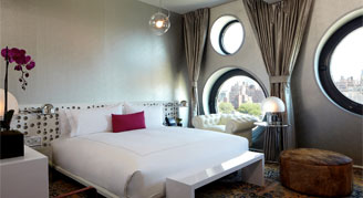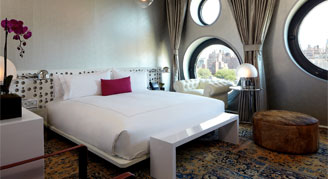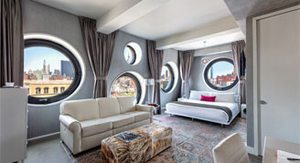 Upgrade your stay with a 500-square-foot room with 10 porthole windows offering amazing views of the skyline, plus a chrome bathtub, a sleeper sofa and a king bed.
