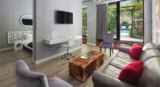 Overlook our unique Dream Beach glass-bottom pool from the balcony of a 300-square-foot loft-style room with Tabriz rugs, teak accents, a work area, and a king bed.