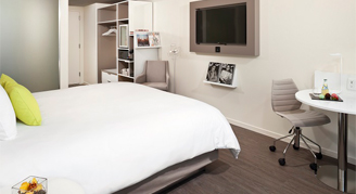 These rooms feature modern, contemporary design and decor. Oversized floor-to-ceiling windows offer ample natural light during the day. Rooms also include flat-screen TVs with separate Bluetooth and USB panel connections, a modern bathroom with rain shower or tub, and Innside bathroom amenities.