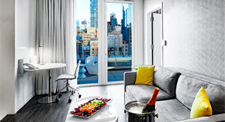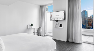 Located on the 18th floor, these oversized rooms feature a terrace and breathtaking views of the midtown skyline, and a modern, contemporary design. Oversized floor-to-ceiling windows offer ample natural light during the day. Rooms also include flat-screen TVs with separate Bluetooth and USB panel connections, and a modern bathroom with rain shower or tub.