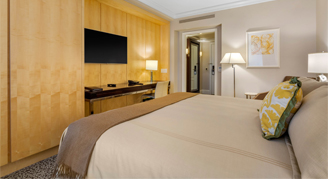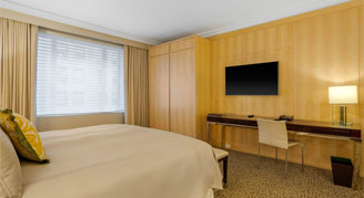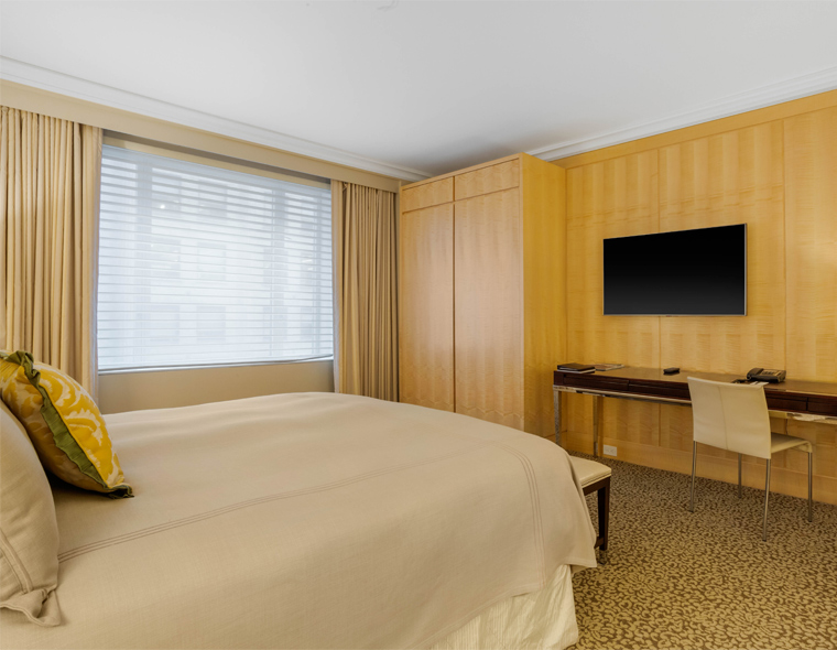 These guest rooms offer a king-sized bed dressed in fine linens, plush duvets and feather pillows. Rooms include a reading desk and a built-in wall unit featuring ample closet and work space. Classic Italian marble bathrooms complete this refined living space with city views.