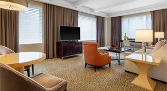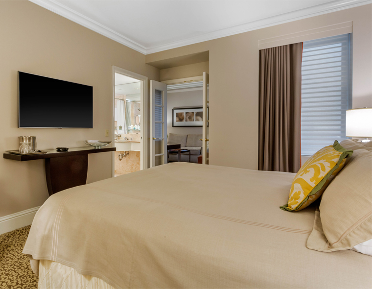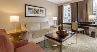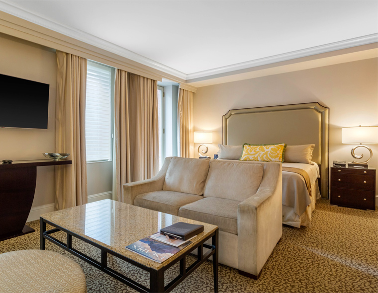 Overlooking 52nd Street and Madison Avenue, these magnificent suites with a king bed feature a large master bedroom with an oversized bath that includes separate shower and soaking tub along with generous counter space. The separate living area has a pull-out sleeper sofa, club chair, desk and an iHome© audio system.