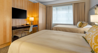 These guest rooms offer two double beds dressed in fine linens, plush duvets and feather pillows. Rooms include a reading desk and a built-in wall unit featuring ample closet and work space. Classic Italian marble bathrooms complete this refined living space.