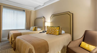 These living spaces contain two double beds dressed in fine linens, plush duvets and feather pillows these luxurious guest rooms feature reading chairs with table and a built-in wall unit providing ample desk and closet space. Classic Italian marble bathrooms complete this refined living space with a city view.