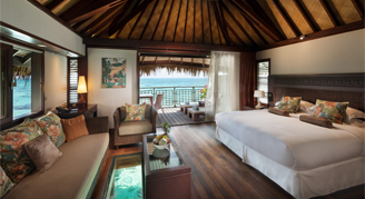 Bungalows are located at the end of pontoon and feature unobstructed views of the lagoon and horizon. Additional amenities include a sundeck with direct access to the lagoon, and a glass window in the floor for viewing fish. The complimentary stocked minibar is refilled daily and includes a selection of soft drinks, beers and mineral waters.