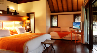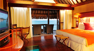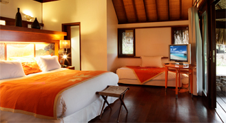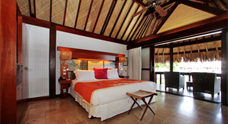 Villas are located on the beach featuring an unobstructed view of the lagoon and the island of Tahiti. Additional amenities include a rain shower and walk-in closet, and a complimentary mini-bar stocked daily with two beers, two bottles of water and two sodas.