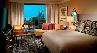 Rooms start at 408-square-feet and include one king or two queen beds, and a spacious bathroom. The luxurious floor plans feature floor-to-ceiling windows and warm colors that reflect the spirit of Music City. Rooms include a workstation, LCD HDTV, and contemporary furnishings with plush bedding. Bathrooms have a walk-in shower or tub, with a lighted vanity.