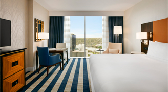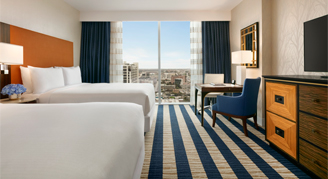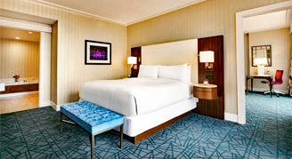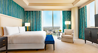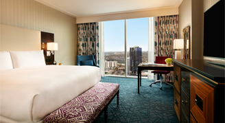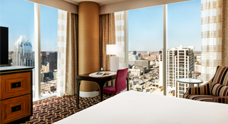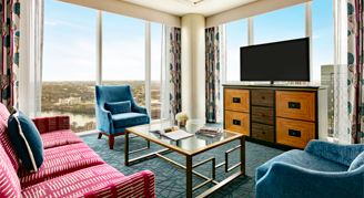 Signature rooms feature the most desirable views of Austin from the 8th and 31st floor and are elegantly appointed with vibrant accents and contemporary décor. Signature Corner rooms boast bedside charging hubs and reading lamps as well as a work desk with upgraded technologies. Guests will enjoy lavish bathrooms with plush bathrobes, and a stylish barn door providing a private water closet.
