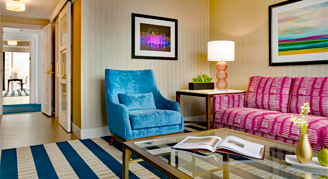 Situated on the 27th through 31st floors, Grand Suites feature striking views of Austin’s cityscape and Lady Bird Lake. At 1,230 square feet, guests can relish in a luxuriously appointed space with rich, vibrant furnishings. The main parlor room has a queen size sofa bed, two oversized chairs, conference, and dining area seating for six, and a large wet bar with separate refrigerator and microwave. Grand Suites boast bedside charging hubs and reading lamps as well as a work desk with upgraded technologies.