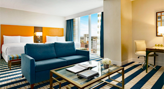 Junior Suites are open concept rooms with elegant sitting areas featuring queen size sofa beds. Situated on the eighth through 31st floors with views of Austin's cityscape, Junior Suites are ideal for families or extended-stays guests. Junior Suites boast bedside charging hubs and reading lamps as well as a work desk with upgraded technologies. Guests will enjoy lavish bathrooms with plush bathrobes, and a stylish barn door providing a private water closet.