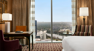 Deluxe rooms feature striking views of Austin's cityscape from the 15th through 31st floors and are elegantly appointed with vibrant accents and contemporary décor. Deluxe rooms boast bedside charging hubs and reading lamps as well as a work desk with upgraded technologies. Guests will enjoy lavish bathrooms with plush bathrobes, and a stylish barn door providing a private water closet.