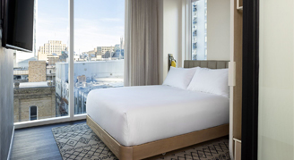 Feel the excitement of vibrant downtown when escaping to this cozy room with priceless views of the streets below from your floor-to-ceiling windows.