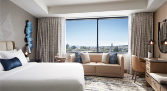 Located on the 7th floor or higher, rooms feature one king bed, a sitting area, desk, and views of the city and Pacific Northwest scenery. Additional amenities include robes and slippers, an Illy coffee maker, and a mini-bar.