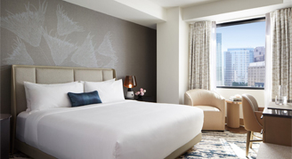 Located on the 7th floor or higher, rooms feature one king bed, a sitting area, desk, and views of the city. Additional amenities include robes and slippers, an Illy coffee maker, and a mini-bar.