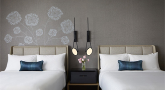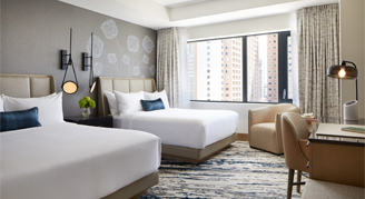 Located on the 7th floor or higher, rooms feature two queen beds, a sitting area, desk, and views of the city. Additional amenities include robes and slippers, an Illy coffee maker, and a mini-bar.