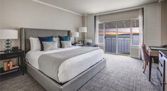 Rooms feature one king bed, a desk, additional sitting chair, bathroom with a shower/tub combo, and balcony with views of the hotel grounds and Lake Washington.