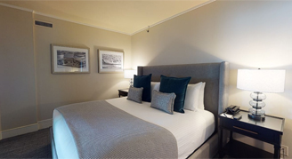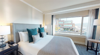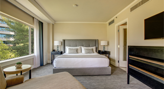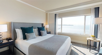 Suites feature a master bedroom with one king bed and a chaise lounge; bathroom with a shower/tub combo; separate living room with a pull-out sofa, chair and desk; and balcony with views of Lake Washington.