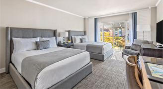 Rooms feature two queen beds, a desk, additional sitting chair, bathroom with a shower/tub combo, and views of the hotel grounds.