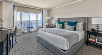 Suites feature one king bed, a desk, bathroom with a shower/tub combo, living room separated by French doors with a pull-out sofa and chair, and balcony with views of the Carillon Point Plaza.