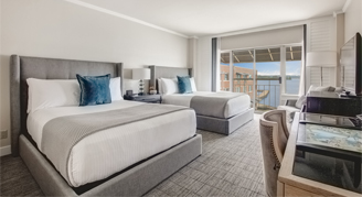 Rooms feature two queen beds, a desk, additional sitting chair, bathroom with a shower/tub combo, and views of the hotel grounds and Lake Washington.