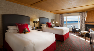 Rooms feature two double beds, a desk, seating area with a fireplace, and views of Elliott Bay.