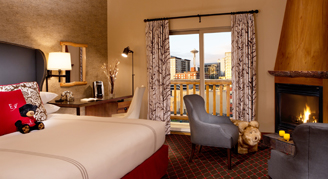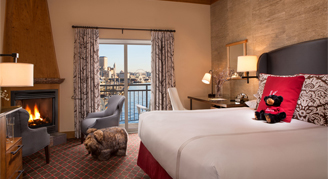 Suites feature one king bed, a separate living room with a desk, pull-out sofa and fireplace, and views of the city.