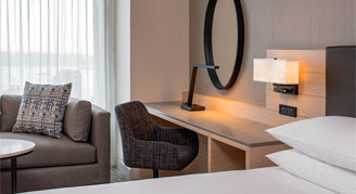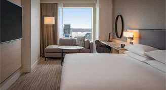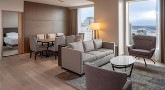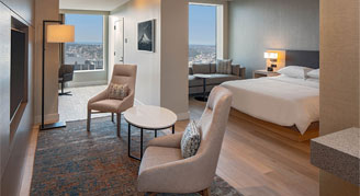 Suites feature a bedroom with one king bed; separate living room with a pull-out sofa, workspace and wet bar; bathroom with dual vanity sinks, a shower and separate soaking tub; and city views.