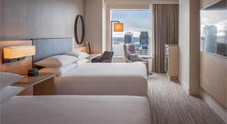 Rooms feature two queen beds, a workspace, sitting area, and city views.