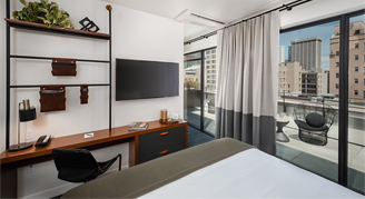 Rooms feature one king bed, a custom-built desk, bathroom with a roll-in shower and furnished terrace with views of the city. Additional amenities include a 49-inch High-Definition TV and terry cloth bathrobes.
