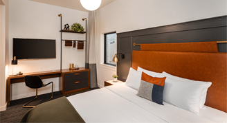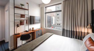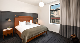 Rooms feature one king bed, a custom-built desk, bathroom with a roll-in shower and views of the city. Additional amenities include a 49-inch High-Definition TV and terry cloth bathrobes.