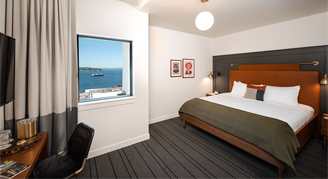 Rooms feature one queen bed, a custom-built desk, bathroom with a walk-in glass enclosed shower and partial views of the water. Additional amenities include a 49-inch High-Definition TV and terry cloth bathrobes.