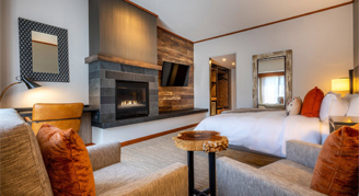 Rooms feature one king bed with Parachute feather bedding, a desk, sitting area, gas fireplace, shower with dual showerheads, and views of the grounds or the historic hydroelectric power plant.